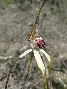 Caladenia excelsa is a terrestrial, perennial, deciduous, herb with an underground tuber and a single erect, hairy leaf, 200–350 mm (8–10 in) long and 6–12 mm (0.2–0.5 in) wide. One or two cream-coloured to greenish-cream flowers 150–300 mm (6–10 in) long and 70–150 mm (3–6 in) wide are borne on a stalk 450–900 mm (20–40 in) tall. The sepals and petals have long, brownish, drooping thread-like tips. The dorsal sepal curves backwards behind the flower, 130–200 mm (5–8 in) long and 3–5 mm (0.1–0.2 in) wide at the base. The lateral sepals are 130–200 mm (5–8 in) long and 5–7 mm (0.2–0.3 in) wide at the base and taper to long, thin tips. The petals are 95–150 mm (4–6 in) long, 3–5 mm (0.1–0.2 in) wide at their bases and taper like the lateral sepals. The labellum is creamy-coloured with a red tip, 25–35 mm (0.98–1.4 in) long, 12–17 mm (0.5–0.7 in) wide and has many thin teeth up to 10 mm (0.4 in) long on its sides. There are four rows of maroon or white calli along the centre line of the labellum. Flowering occurs from late September to early November.[2][3][4]