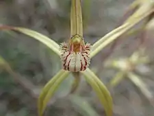 This caladenia occurs between Williams and York in the Avon Wheatbelt, and Jarrah Forest biogeographic regions where it grows in moist soils in ephemeral creeks and near granite outcrops.[2][3][4][6]