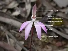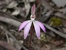 The single white or pink flower is borne on a spike up to 150 mm (6 in) high. The dorsal sepal is erect, linear in shape, 7–12 mm (0.3–0.5 in) long, 1–2 mm (0.04–0.08 in) wide with a pointed end. The lateral sepals and petals are usually 6–12 mm (0.2–0.5 in) long, about 2 mm (0.08 in) wide, with their outer surfaces densely covered with a band of short, reddish-brown glandular hairs. The labellum is egg-shaped, about 6 mm (0.2 in) long and wide, white or pinkish with three lobes and prominent red stripes. The mid-lobe is small and pointed with small teeth on the edge and several rows of yellow-tipped calli in the centre. The lateral lobes are prominent, broad and protrude past the mid-lobe. The column is 5–7 mm (0.2–0.3 in) long, curves inwards and has narrow wings. Flowering occurs in September and October and is followed by a non-fleshy, dehiscent capsule containing a large number of seeds. It is similar to Caladenia carnea but is distinguished from it by its single flower, earlier flowering period and red stripes on the labellum and column.[2][3][4]