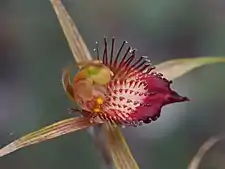 Tuart spider orchid occurs between Yanchep and Busselton in the Jarrah Forest and Swan Coastal Plain biogeographic regions where it grows in deep sandy soil in woodland, especially tuart woodland.[2][3][4][5]