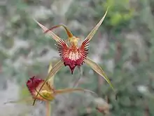 Caladenia georgei, commonly known as the tuart spider orchid, is a species of orchid endemic to the south-west of Western Australia. It has a single, hairy leaf and up to three whitish to yellowish-green flowers flushed with red and which have a white labellum with a red tip.