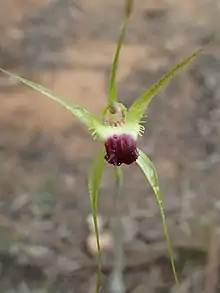 Caladenia infundibularis, commonly known as the funnel-web spider orchid is a species of orchid endemic to the south-west of Western Australia. It has a single hairy leaf and up to three greenish-yellow flowers which have a red-tipped labellum.