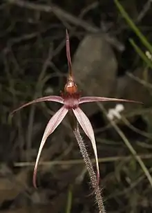 Caladenia orestes was first formally described in 2006 by David Jones who gave it the name Arachnorchis orestes. The specimen was collected near Burrinjuck village and the description was published in Australian Orchid Research.[3] In 2010 Gary Backhouse changed the name to Caladenia orestes and published the change in The Victorian Naturalist.[1] The specific epithet (orestes) is an Ancient Greek word meaning "mountaineer"[4] referring to the steep mountain slopes where this species grows.[2]