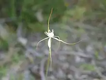 Caladenia speciosa is a terrestrial, perennial, deciduous, herb with an underground tuber and a single erect, hairy leaf, 150–250 mm (6–10 in) long and 5–12 mm (0.2–0.5 in) wide. Up to three flowers 120–180 mm (5–7 in) long and 100–150 mm (4–6 in) wide are borne on a stalk 350–600 mm (10–20 in) tall. The flowers are white, often with a pink or red tinge. The sepals and petals have long, thin, brownish thread-like tips. The dorsal sepal is erect, 80–130 mm (3–5 in) long and 2–4 mm (0.08–0.2 in) wide. The lateral sepals are 80–150 mm (3–6 in) long and 5–9 mm (0.2–0.4 in) wide, spread widely and horizontally near their base but then curve downwards. The petals are 65–105 mm (3–4 in) long and 3–6 mm (0.1–0.2 in) wide and arranged like the lateral sepals. The labellum is 20–30 mm (0.8–1 in) long, 8–16 mm (0.3–0.6 in) wide and white but with erect, narrow red teeth up to 15 mm (0.6 in) long on the sides. The tip of the labellum is curled under and there are between four and six rows of pink or white calli along the mid-line of the labellum. Flowering occurs from September to October but is more prolific after fire the previous summer.[2][3][4]