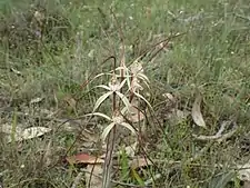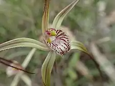 Caladenia straminichila was first described in 2015 by Andrew Phillip Brown and Garry Brockman from a specimen collected near Boyup Brook and the description was published in Nuytsia.[1] According to Brown and Brockman, the specific epithet (straminichila) is derived from the Latin stramineus (straw-yellow) and chilus (-lipped), referring to the colour of the labellum.[2] Within the same article, Brown and Brockman identify chilus as Greek.[2] In classical Latin and ancient Greek, chilus is not attested,[5][6] while cheilos (χεῖλος) means 'lip' in ancient Greek.[6] Before its formal description, this orchid was known as Caladenia sp. 'Moodiarrup'.[1][3]