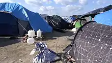 Since the demolition of the Jungle in 2016, there has been a policy of "no fixation points" for migrants to settle in, aiming to stop another large camp from forming.[110] Police, including the Compagnies Républicaines de Sécurité (CRS), and clearance teams regularly evict migrants from their makeshift camps with new encampments later forming in another or the same location.[111][112][113][114] The encampments are dangerous due to exposure and poor living conditions resulting in health difficulties.[115][116][117][118] The United Nations has repeatedly spoken out about what its experts say are unacceptable conditions for migrants in the area.[119][120][121] A hostile environment is created for the migrants,[122][123] with migrants and NGOs supporting migrants[124] reporting violence from the police[114][125][109][126] and the local administration occasionally banning the distribution of food and water to migrants.[127][128]