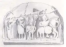 The bas-relief is classified as a tombstone, on which a Roman officer is shown on horseback carrying a shield.[3] Behind the officer is the standard bearer with his insignia.[4] As of Baddeley’s publication in 1925, the stone was still embedded within the inner barn wall.