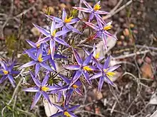 Calectasia grandiflora is one of eleven species in the genus Calectasia. It was first described by Ludwig Preiss in Plantae Preissianae in 1846.[3] The specific epithet (grandiflorum) is from the Latin grandis = great and floris = flower referring to the flowers that are relatively large compared to those of the similar C. narragara.[1] It is commonly called the blue tinsel lily.[4] "Large-flowered tinsel lily" has been proposed as an alternate common name to distinguish it from other members of the genus.[1]