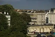 Numbers 32 to 44 Caledonia Place was completed in 1788 to the design of Bath architect and surveyor, John Eveleigh.[4] The central and end houses of the terrace are pedimented and broken forward with the variation giving the terrace a palatial appearance. Numbers 43 and 44 were converted into one in 1922 to form a bank.