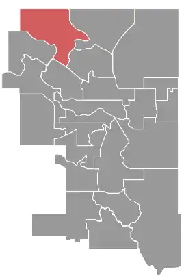 | Starting at the intersection of the north Calgary city boundary with the west Calgary city boundary; then 1. east along the north city boundary to Simons Valley Road NW; 2. south along Simons Valley Road NW and Beddington Trail NW to Country Hills Boulevard NW; 3. west along Country Hills Boulevard NW to Shaganappi Trail NW; 4. southwest along Shaganappi Trail NW to John Laurie Boulevard NW; 5. northwest along John Laurie Boulevard NW to Sarcee Trail NW; 6. north along Sarcee Trail NW to Country Hills Boulevard NW; 7. northwest along Country Hills Boulevard NW to 112 Avenue NW; 8. west along 112 Avenue NW to the west Calgary city boundary; 9. north along the west Calgary city boundary to the starting point. | |||