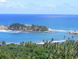 Calibishie gets its name from the native Arawakan language that was spoken by the island's first occupants, the Kalinagos, later renamed “Caribs” by European colonizers. In Arawakan, the word cali translates to “net,” and bishie is “reef,” thus Calibishie has been translated to mean "net of reefs".[1] The Kalinagos utilized Calibishie's natural setting as it lies along the only barrier reef on the island. The location provided sustenance through fishing and agriculture, along with a forest above the village, which they used for wood materials, such as carved canoes.