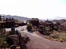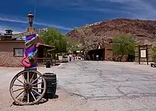 Calico is a ghost town and former mining town in San Bernardino County, California, United States. Located in the Calico Mountains of the Mojave Desert region of Southern California, it was founded in 1881 as a silver mining town, and was later converted into a county park named Calico Ghost Town. Located off Interstate 15, it lies 3 miles (4.8 km) from Barstow and 3 miles from Yermo. Giant letters spelling CALICO are visible, from the highway, on the Calico Peaks behind it. Walter Knott purchased Calico in the 1950s, and architecturally restored all but the five remaining original buildings to look as they did in the 1880s. Calico received California Historical Landmark #782,[3] and in 2005 was proclaimed by then-Governor Arnold Schwarzenegger to be California's Silver Rush Ghost Town.[4]