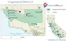 Following redistricting in 2021, the district is still in the San Joaquin Valley. It includes most of Kings County and parts of Tulare and Kern Counties. It includes the east side of Bakersfield; the west and south sides of Tulare, the south side of Hanford; and all of Porterville, Lindsay, Shafter, Wasco, Delano, McFarland, Arvin, Lamont, and Corcoran.[3] The new 22nd is a majority-Latino district.