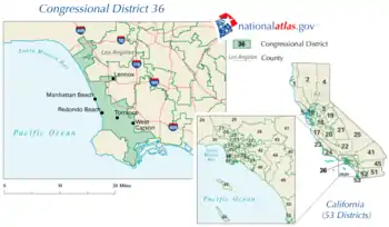 California's 36th congressional district is a U.S. congressional district in California. The 36th district is located primarily in the South Bay and Westside regions of Los Angeles. It takes in the cities of Beverly Hills, Santa Monica, the west side of Culver City, Hermosa Beach, Rancho Palos Verdes, Redondo Beach, Palos Verdes Estates, Rolling Hills Estates, El Segundo, Lomita, Manhattan Beach, and the west side of Torrance, as well as the Los Angeles neighborhoods of Venice, Playa del Rey, Palms, Cheviot Hills, Westwood Village, West Los Angeles, Mar Vista, Westchester, Marina Peninsula, and west side Harbor City.