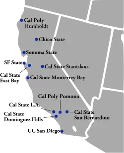 The California Collegiate Athletic Association (CCAA) is a college athletic conference affiliated with the National Collegiate Athletic Association (NCAA) at the Division II level.[1] All of its current members are public universities, and upon UC San Diego's departure on July 1, 2020, all are members of the California State University system (two of them being Cal Polys).[2]