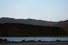 US 395 traverses the entire length of the Owens Valley, entering the valley near the former site of the Owens Lake. The valley, named for one of explorer John C. Fremont's guides, was primarily home to the Timbisha and Paiute peoples before European settlement. Formerly a fertile lake and valley, Owens Lake and the southern portion of the valley are now dry. Water from the valley is channeled for use by the City of Los Angeles, via the Los Angeles Aqueduct, which was constructed during what is commonly called the California Water Wars.[17] Along the shores of Owens Lake, the highway passes by Cartago and Olancha. Just north of the lake is Lone Pine. Lone Pine is noted as an access for both the highest point in the contiguous United States, Mount Whitney, and the lowest point in North America, Badwater Basin in Death Valley. Both Mount Whitney and the mountains surrounding Death Valley are visible from US 395.[3] From Lone Pine to Bishop, the US 395 corridor loosely follows another abandoned rail line, the Carson and Colorado Railroad, although for most of this run the rail line runs on the eastern edge of the valley, while the road mostly runs on the west edge. The US 395 corridor from Lone Pine north to the Nevada state line is noted for a high concentration of natural hot springs leading to the area being known as the "hot springs jackpot".[18]