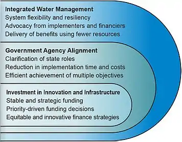 Three Themes Graphic from Update 2013. - Strengthen Government Agency Alignment: A key principle of IWM seeks to improve the way governments interact and ultimately deliver services. Aligning agencies in a collaborative manner, across jurisdictional boundaries at the appropriate geographic scale, provides for more efficiency in addressing water problems. The alignment would include management of data, planning, policy-making, and regulation across local, State, tribal, and federal governments.