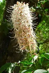 The flowers are sweet-scented, white to pale pink, borne on erect panicles 15–20 cm (6–8 in) long and 5–8 cm (2–3 in) broad. The fruit is a fig-shaped capsule 5–8 cm (2–3 in) long, containing a large, round, orange-brown seed, measuring 2–7 cm (0.8–2.8 in). The seeds are poisonous[1] and are the largest known of any temperate (non-tropical) plant species.