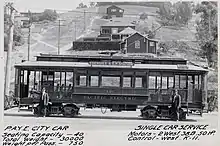 A California Car is a type of single-deck tramcar or streetcar that features a center, enclosed seating compartment and roofed seating areas without sides on either end. These cars were popular in California's mild Mediterranean climate offering passengers a choice of shaded outdoor seating during hot weather, or more protected seating during cool or rainy weather. They were also used in other climates to provide separate outdoor smoking and enclosed non-smoking areas. Some very early motor buses also used the combination car design.[1][2][3]