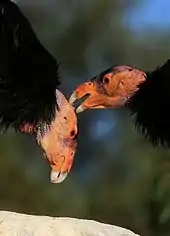The condor's head has little to no feathers, which helps keep it clean when feeding on carrion.[27] The skin of the head and neck is capable of flushing noticeably in response to emotional state.[28] The skin color varies from yellowish to a glowing reddish-orange.[25] The birds do not have true syringeal vocalizations. They can make a few hissing or grunting sounds only heard when very close.[29]