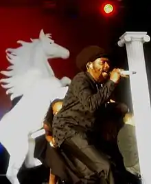 The name Caligola is derived from the Roman emperor Caligula who is most famous for his lavish, excessive style of living and his madness that reached its height when he made his favourite horse a Senator.[3] Hence the two stallions in the music project's logo, referring both to Caligula and music's sexual energy. According to Gustaf Norén, the artists' collective Caligola is based on the idea of building a community;[4] the black capes worn by performers represent the equality of artists and the renunciation of their differences.[4] Their goal is to overcome conventions and borders and to expand and connect art in all its forms.[4]