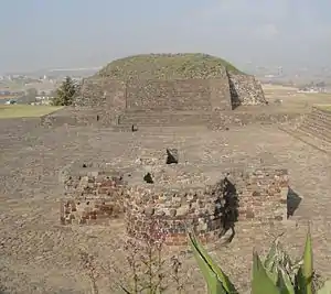 The Postclassic site extended approximately 264 hectares, covering portions of the valley floor, the majority of the Cerro Tenismo hill, and portions of a smaller hill to the east.[3] All of the major monumental architecture at the site was built during this period. Unlike many Postclassic Mesoamerican cities, which usually have a single central group of monumental architecture, the large structures at Calixtlahuaca are split into multiple smaller architectural groups scattered from the valley floor to the summit of the hill. The areas between the monumental groups were filled in with a mixture of commoner houses and agricultural terraces.[3]