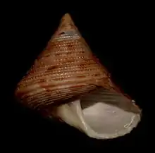 | A shell of Calliostoma bullisi Clench & Turner, 1960, 27.4 mm height by 27.4 mm diameter, trawled at 70 m off the coast of Sierra Leone, Africa | |