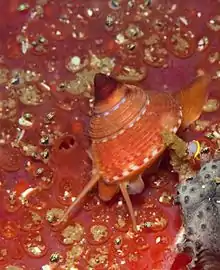 The foot is orange and there are distinct black eye spots at the base of paired tentacles.[3]