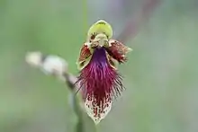 Calochilus caeruleus, commonly known as the wiry beard orchid,[2] is a species of orchid native to northern Australia and New Guinea. It has a single leaf which continues to develop during flowering and up to twelve greenish flowers with reddish brown markings and a labellum with a red "beard".