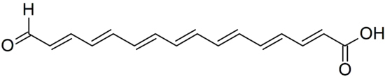 The assignment of Calostoma to the Boletales placed it in an order whose biochemistry has been the topic of research. Most members of the Boletales are characterized by compounds produced by the shikimate-chorismate pathway,[29] including several distinctive pigments.[30][31] Gertraud Gruber and Wolfgang Steglich were not able to detect these compounds in C. cinnabarinum, but isolated a novel polyene pigment. This compound, named calostomal, is responsible for the orange-red color of the fruit bodies. The methyl ester of calostomal was subjected to NMR spectroscopy and was identified as all-trans-16-oxohexadeca-2,4,6,8,10,12,14-heptaenoic acid.[19] Chemically related pigments, the boletocrocins, had been isolated from the brightly colored Boletus laetissimus and B. rufoaureus.[32] It is not yet clear if the results of this chemotaxonomic investigation will mandate changes to Boletales cladistics.[19]