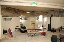 The first floor of the keep has been restored to its early 20th-century appearance as a barracks room.[58] The second floor was redeveloped in the late 19th century to form another barracks room, with its ceiling incorporating additional early 20th-century girders and concrete to support the gun battery above it.[60] The roof of the keep has two 12-pounder gun mounts with their original gun-lockers; there is a 12-pounder gun on display originally used on a Royal Naval vessel.[60] The keep's roof would originally have been flat, with crenellations for artillery, but both the roof and crenellations were removed in the 1770s.[58]