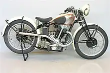 In the late 1920s, the company launched a new range under the sub-brand of Ivory Calthorpe. Using a self-produced single-cylinder sloper-design engine, the engine was similar in proportions and output to contemporary BSA units.[10] The ohv twin-port 348cc launch unit was fitted into a full-cradle duplex frame, and used a 3-speed Burman gearbox, with a tank mounted change.[10] The engine breathed through an Amal carb, and used a BTH magneto mounted to the rear of the cylinder. By 1935 there was a 498cc option, but top speeds were similar at around 70 miles per hour (110 km/h). The design was sit-in as opposed to traditional bicycle sit-on design, later described by one tester as a "sack-of-potatoes slump!"[10] With a marketing unit by no sales team, the motorcycles were exclusively sold by London-based dealer Pride & Clark in Stockwell Road, Brixton.[10] P&C stated that the units should be sold at £52 and £54 respectively - a relatively high pricing for the time, but one which left a slim margin for Calthorpe MCC.[10]