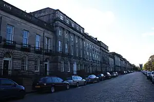 Most of the properties on the terraces are occupied as houses but on Royal Terrace there is a number of hotels, by far the largest being the Crowne Plaza Hotel[20][21] while on Regent Terrace is located the United States Consulate.[4] Royal Terrace with its views over Leith and the Firth of Forth was popular with early owners who were shipowners and traders in Leith. Some of these were involved in the whisky trade, Leith being a centre for whisky blending and storage, and for a time in the 19th century the street was known as Whisky Row.[1][4] Louis-Antoine, Duke of Angoulême (the elder son of Charles X of France, last of the Bourbon kings) and his wife Marie-Thérèse-Charlotte, (the daughter of Louis XVI of France and Marie Antoinette), moved into what is now 22 (then 21) Regent Terrace in 1830.[4] Marie-Caroline de Bourbon-Sicile, duchess de Berry, sister in law of the Duc d'Angoulême, also lived at what is now 12 (then 11) Regent Terrace at that time.[22] Her young son, Henri, the Comte de Chambord, is said to have wept bitterly when his family left for Austria in 1832 as he had become very attached to Scotland.[4] The painter Francis Cadell, one of the Scottish Colourists, lived in 30 Regent Terrace from 1930-1935.[4][23] The western end of Regent Terrace was closed in 2001 to traffic because of security concerns about the United States Consulate.[24]