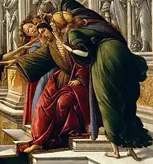 Other scenes probably derive from ancient engraved gems, and one recreates another of Lucian's descriptions, of a family of centaurs by Zeuxis (below the throne).[16] In general, though many of the subjects of the decorative sculpture are classical, the style of their depiction, especially in the statues, is firmly from Botticelli's own period.[17] The palace is beside the sea, which can be seen, flat and plain, through the windows;[18] as often, Botticelli has little interest in enlivening his depiction of landscape with detail. The living figures contrast in style with the statues, and are all thin and elongated in a rather mannered way.[19]