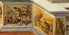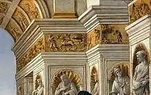 Ronald Lightbown considers the painting may have originally been intended for Botticelli's own pleasure and use, as the Mystic Nativity seems to have been. Without any description of the setting in Lucian or Alberti, Botticelli has imagined a throne room very elaborately decorated with sculptures and reliefs of classical heroes, creatures from ancient myth, and battle scenes. The extensive reliefs around the room contain some quotations from earlier paintings of his, including the spalliere paintings of the story of Nastalgio degli Onesti, and his Return of Judith to Betulia.[13] The figure of "Truth" is clearly derived from the Venus of his Birth of Venus.[14] The Saint George-like statue in a niche above the central group seems to be from a fresco by Andrea del Castagno.[15]