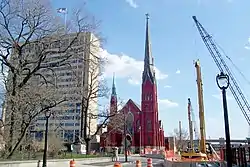![]() Calvary Presbyterian Church during construction on the Marquette Interchange | |