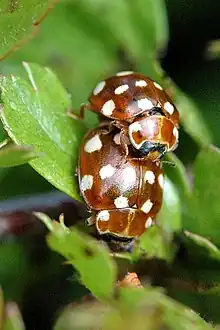 This ladybird is also sometimes known as the cream-spotted ladybird, polkadot ladybird or eighteen spot ladybird and may be confused with another beetle also known as the eighteen-spot ladybird (Myrrha octodecimguttata). The latter is usually found on pine trees and is smaller and a paler brown colour and has a characteristic M-shaped white mark on its pronotum.[3]