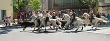 The Raço di Biòu is raised principally for the traditional sport of the course camarguaise, a type of bloodless bull-running in which castrated bullocks are used. In the ring, raseteurs must try to remove a cockade from the forehead of the bull. The bullocks are driven on foot to the arena by mounted gardians (the abrivado), and returned to the manade in the same way (the bandido).[4]