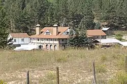 The Cambria Casino, also known as the Flying V Guest Ranch and the Cambria Casino Park-Memorial, is a resort on the western edge of the Black Hills in Weston County, Wyoming. The resort was named for Cambria, a nearby coal-mining community. The two-story sandstone lodge, designed by New York architect Bruce Rabenold, employs English Tudor and other medieval details to create a Tudor manor-like setting in the Wyoming hills. The lodge fronts on a court, entered through a gatehouse and originally flanked by wings housing guest rooms. The property is significant as an example of a unique eclectically style resort in eastern Wyoming. A portion of the casino was intended to serve as a memorial to Cambria-area miners.[2]