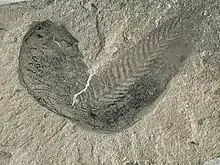 University of Cambridge palaeontologist Harry B. Whittington and his student Simon Conway Morris re-analysed the specimens and came to an opinion in 1977 that Pikaia was obviously a chordate: the body segments were similar to muscle blocks in chordates, and a rod-like structure spans the body length, an indication of notochord, a defining structure of chordates.[9][10] Their article in the Scientific American in 1979 affirmed the chordate status, saying: "The chordates are represented in the Burgess Shale by the genus Pikaia and the single species P. gracilens."[11] Conway Morris published the formal classification as a chordate in 1979.[12] Harvard University palaeontologist Stephen Jay Gould popularised Pikaia as an ancestral species of chordates in his 1989 book Wonderful Life: The Burgess Shale and the Nature of History,[13] from which Pikaia became known as the "most famous early chordate fossil,"[14] or the earliest chordate,[15] or the oldest ancestor of humans.[16][17]
