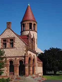 The main building of the Cambridge Public Library is an historic library building at 449 Broadway. It was built in 1888 with land and full construction funding donated by Frederick H. Rindge, a Cambridge native and philanthropist. Its Richardsonian Romanesque design was by Van Brunt & Howe. The building was added to the National Register of Historic Places in 1982.