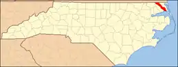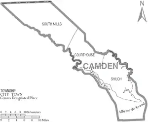 Camden County is a consolidated city-county located in the U.S. State of North Carolina. As of the 2020 census, the population was 10,335,[1] making it the fourth-least populous county in North Carolina. Its county seat is Camden.[2] Camden County is part of the Elizabeth City, NC Micropolitan Statistical Area, which is also included in the Virginia Beach-Norfolk, VA-NC Combined Statistical Area.