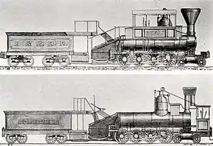 In 1853 Ross Winans, who had designed the "muddiggers", built the first of a series of 0-8-0 camel locomotives. These had long cabs that ran from the back of the smokebox to the front of the firebox. The firebox itself sloped back on the earliest models. The fireman worked from a large platform on the tender, and in some cases had a chute to allow him to deliver coal to the front of the grate.