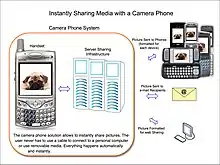 Camera phones can share pictures almost instantly and automatically via a sharing infrastructure integrated with the carrier network. Early developers including Philippe Kahn envisioned a technology that would enable service providers to "collect a fee every time anyone snaps a photo".[25] The resulting technologies, Multimedia Messaging Service (MMS) and Sha-Mail, were developed parallel to and in competition to open Internet-based mobile communication provided by GPRS and later 3G networks.