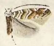 The wingspan is 6.5-8.5 mm. Adults are on wing in spring in two generations per year.