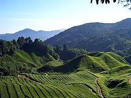 Geographically, the resort is located on the highland "spine" of Peninsular Malaysia. It owes its present standing to its location at a high altitude (generally between 800 metres (2,600 ft) to 1,603 metres (5,259 ft) above sea level).[30] There are eight mountains at the retreat. They are Mount (Malay: Gunung) Batu Brinchang (2,031 metres (6,663 ft)), Mount Berembun (1,840 metres (6,040 ft)), Mount Irau (2,091 metres (6,860 ft)), Mount Jasar (1,696 metres (5,564 ft)), Mount Mentigi (1,563 metres (5,128 ft)), Mount Perdah (1,576 metres (5,171 ft)) and Mount Siku (1,916 metres (6,286 ft)).[27] Mount Swettenham (1,961 metres (6,434 ft)) is located on its border with Kelantan. At the top of Mount Batu Brinchang is a radio and television station. It was constructed by the British in the early 1950s. Close to it is the mossy forest. The trail to the forest starts from the Sungei Palas Boh Tea Plantation. It takes about 15 minutes to reach the cloud forest by road.