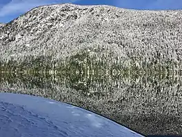 ![]() Cameron Lake in winter from Beaufort Picnic Site with railway trestle in background. | |