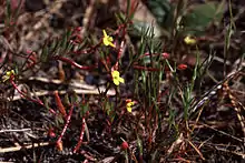 The flower has four yellow petals a few millimeters long which may have red spots near the bases.