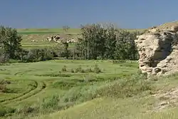 ![]() Camp Disappointment, 2005, view northeast from south bluff. Camp site marked by fenced-in historical marker. Cottonwood trees in background line the banks of Cut Bank Creek. The ledge to the right was an Indian buffalo jump. | |