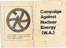 The Campaign Against Nuclear Energy (CANE) was established in Perth, Western Australia on 14 February 1976 by Friends of the Earth (FOE). It included Peter Brotherton, John Carlin, Mike Thomas and Barrie Machin. CANE was a non-profit grass roots organisation whose aim was to stop the establishment of a nuclear power plant in Western Australia (WA) and to halt uranium mining. The organisation operated out of the Environment Centre in Wellington Street, Perth. The Whitlam Federal government in 1974 had dedicated about A$7,000 per state to set up Regional Environment Centres. Perth's Environment Centre housed other groups including the Australian Conservation Foundation, the Conservation Council of Western Australia, Friends of the Earth, and the Campaign to Save Native Forests. A CANE group was also established in Adelaide, South Australia.